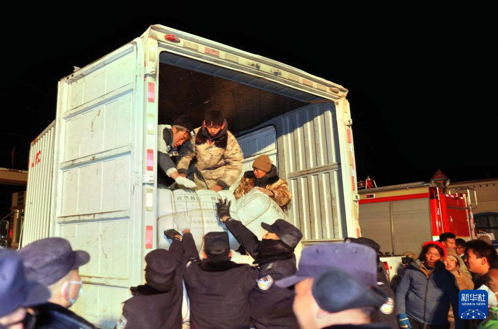 1月7日,救援人员在定日县措果乡装运救灾物资。新华社记者 姜帆 摄