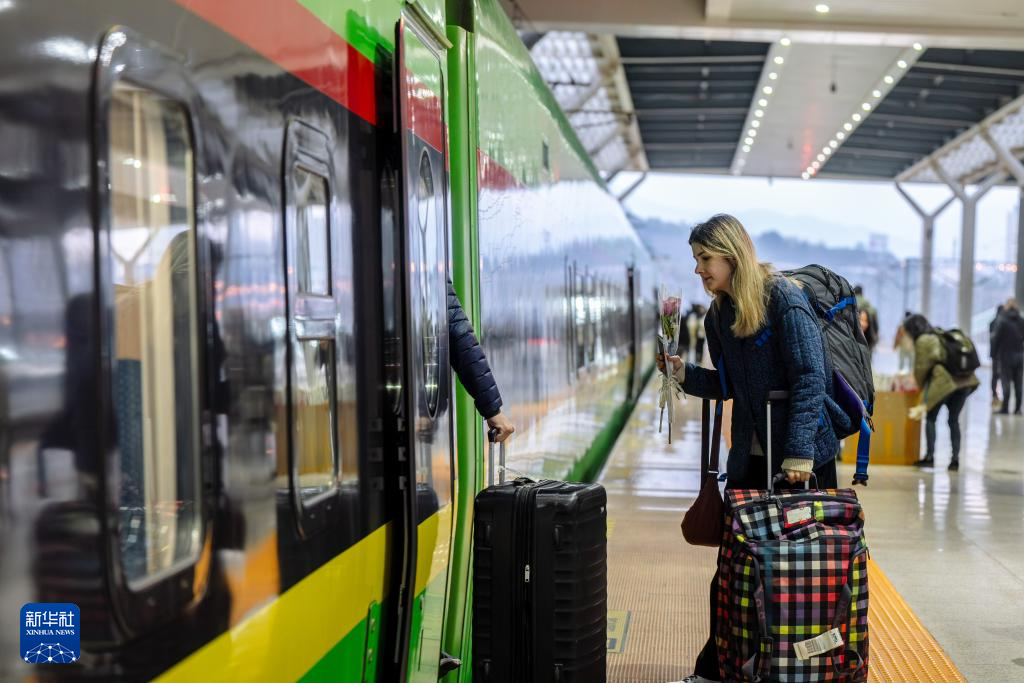 1月14日,旅客在昆明南站乘坐D87次中老铁路国际旅客列车。