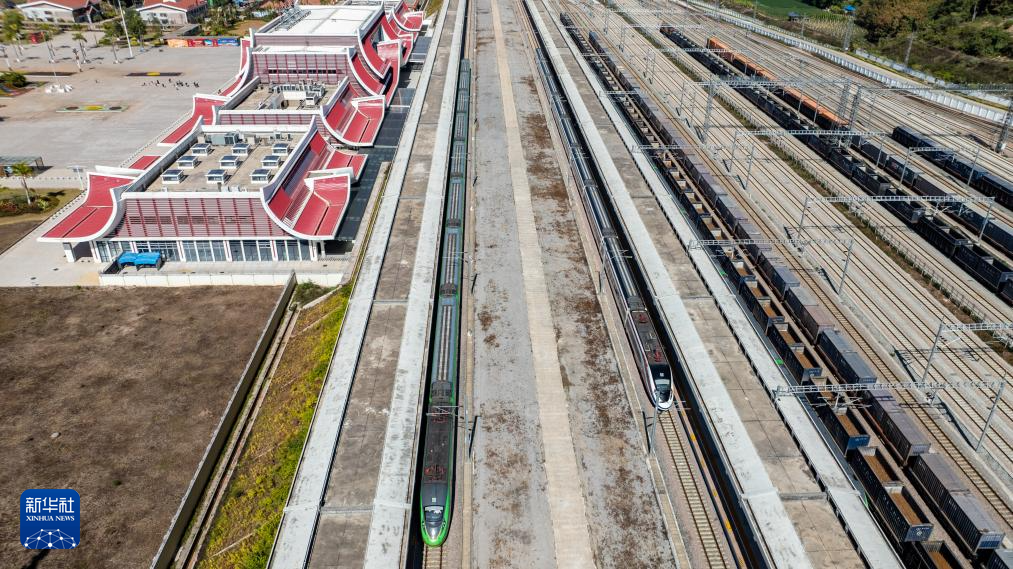 1月14日,D87次中老铁路国际旅客列车(左)和“澜沧号”动车组列车停靠在中老铁路磨憨站(无人机照片)。