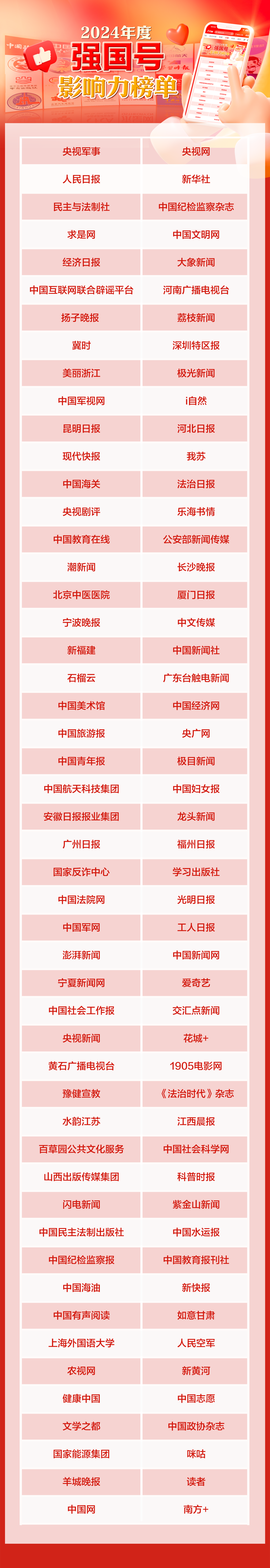 金龙展翅高飞去,银蛇曼舞迎春来。2024年,1100余家强国号发挥资源优势,为“学习强国”矩阵建设贡献力量。在此辞旧迎新之际,“学习强国”学习平台推出“2024年度强国号影响力榜单”(100家)和“2024年度强国号新秀榜”(10家),向辛勤耕耘的强国号单位表达真诚的感谢!新的一年,让我们携手并进,再出发!