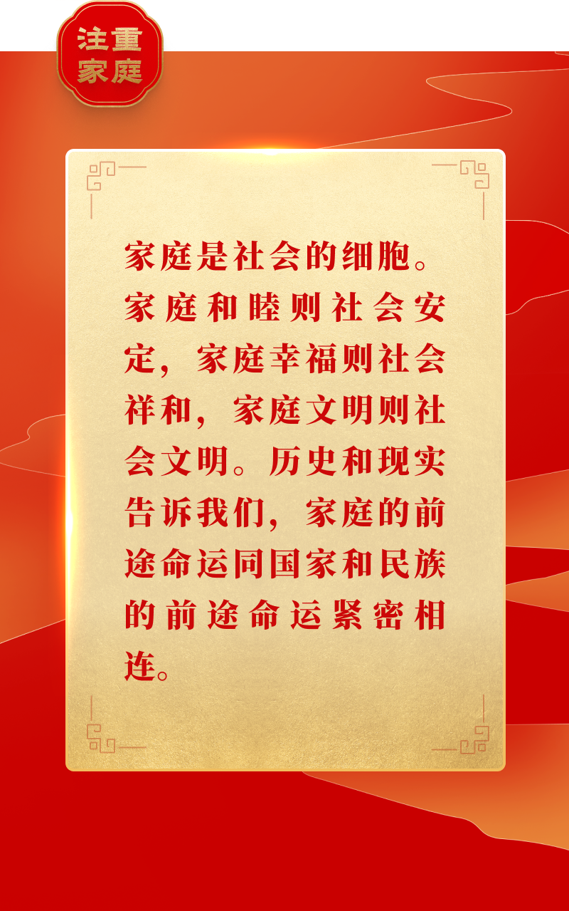 “家庭和睦则社会安定,家庭幸福则社会祥和,家庭文明则社会文明。”“家庭的前途命运同国家和民族的前途命运紧密相连。”