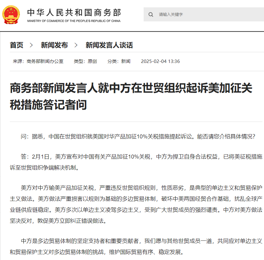 答:2月1日,美方宣布对中国有关产品加征10%关税,中方为捍卫自身合法权益,已将美征税措施诉至世贸组织争端解决机制。
