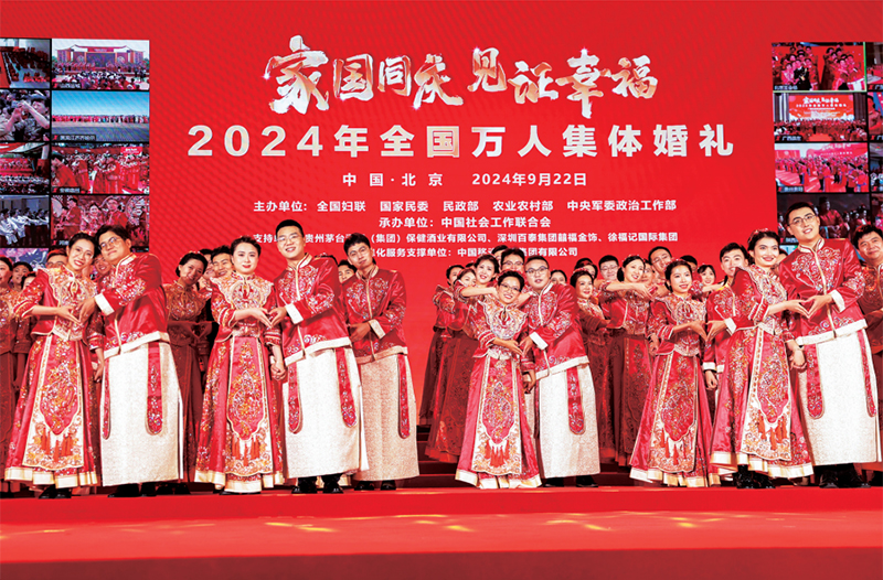 2024年9月22日,全国妇联联合有关部门在全国各地50个会场,同步举办“家国同庆 见证幸福”2024年全国万人集体婚礼。新人代表发出了争做中华家庭美德的传承者、新型婚育文化的引领者、社会主义家庭文明新风尚的践行者倡议。图为新人们在北京主会场拍照留念。新华社记者 张玉薇/摄