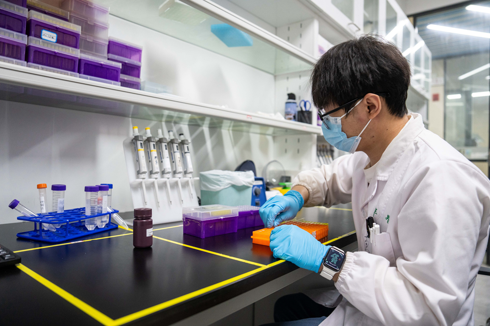 图为2024年11月23日,岳麓山种业创新中心的华智生物技术有限公司检测检验实验室内,工作人员在进行水稻全基因组建库实验。 新华社记者 阮周围/摄