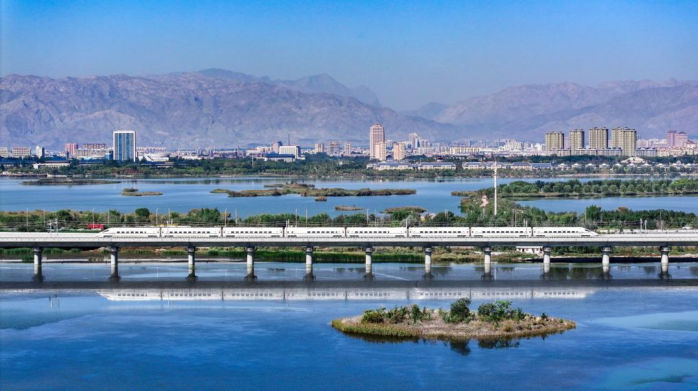 图为2024年10月3日,一列动车组列车行驶在包银高铁惠银段石嘴山特大桥上。新华社记者 冯开华/摄