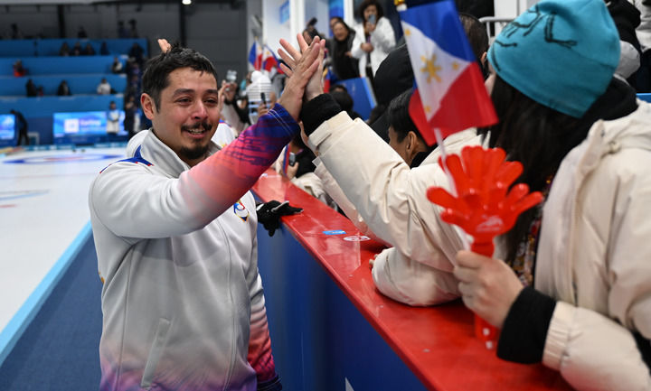 2025年2月14日,菲律宾队选手马克·安赫洛·普菲斯特在亚冬会男子冰壶金牌赛后庆祝。新华社记者 赵子硕 摄