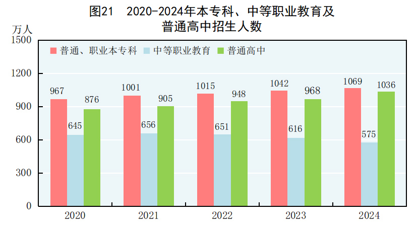 全年研究生教育招生135.7万人,在学研究生409.5万人,毕业生108.4万人。普通、职业本专科[74]招生1068.9万人,在校生3891.3万人,毕业生1059.4万人。中等职业教育[75]招生575.4万人,在校生1659.4万人,毕业生542.2万人。普通高中招生1036.2万人,在校生2922.3万人,毕业生891.0万人。初中招生1848.8万人,在校生5386.2万人,毕业生1698.2万人。普通小学招生1616.6万人,在校生10584.4万人,毕业生1857.3万人。特殊教育招生15.8万人,在校生91.6万人,毕业生17.7万人。学前教育在园幼儿3584.0万人。九年义务教育巩固率为95.9%,高中阶段毛入学率为92.0%。