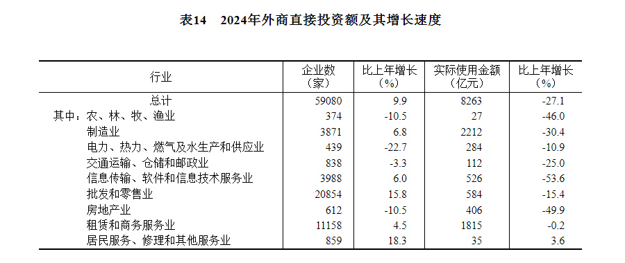 全年新设外商投资企业59080家,比上年增长9.9%。实际使用外资8263亿元,下降27.1%,折1162亿美元,下降28.8%。其中,共建“一带一路”国家(含通过部分自由港对华投资)对华新设外商投资企业17172家,增长23.8%;对华直接投资1147亿元,下降6.2%,折161亿美元,下降8.4%。高技术产业实际使用外资2864亿元,下降32.3%,折403亿美元,下降34.0%。