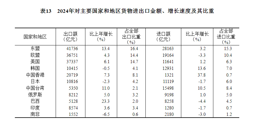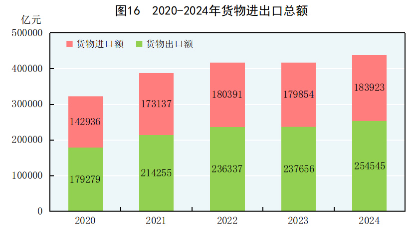 全年货物进出口总额438468亿元,比上年增长5.0%。其中,出口254545亿元,增长7.1%;进口183923亿元,增长2.3%。货物进出口顺差70623亿元。对共建“一带一路”[50]国家进出口额220685亿元,比上年增长6.4%。其中,出口122095亿元,增长9.6%;进口98589亿元,增长2.7%。对《区域全面经济伙伴关系协定》(RCEP)其他成员国[51]进出口额131645亿元,比上年增长4.5%。民营企业进出口额243329亿元,比上年增长8.8%,占进出口总额比重为55.5%;其中出口164717亿元,增长9.4%。