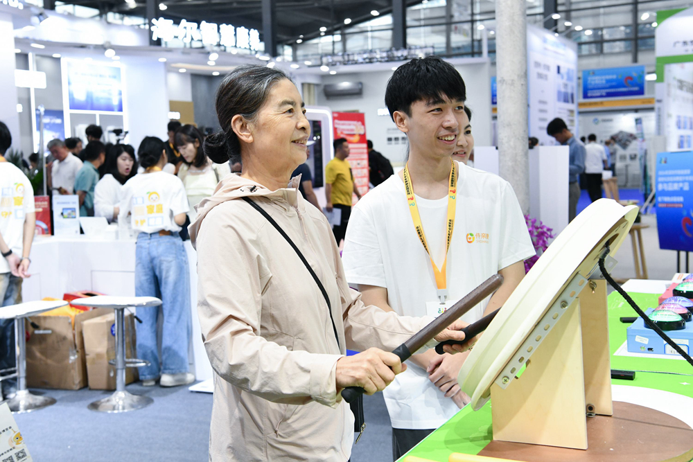 2024年10月25日至27日,2024深圳国际智慧养老产业博览会在深圳会展中心(福田)举行,吸引全球203家智慧养老企业参展,集中展示超过1000种智慧养老产品和技术。图为2024年10月27日,老人在博览会上体验乐龄鼓。新华社记者 梁旭/摄