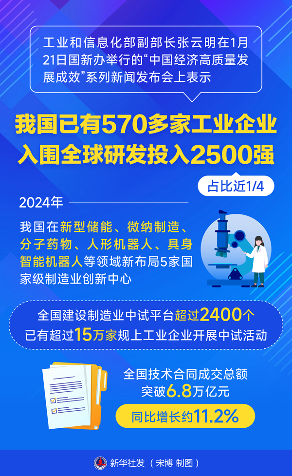 在2025年1月21日国新办举行的“中国经济高质量发展成效”系列新闻发布会上,工业和信息化部负责同志介绍,我国已有570多家工业企业入围全球研发投入2500强,占比近1/4。新华社发 宋博/制图