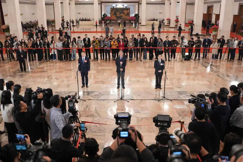 图为2025年3月10日,全国政协十四届三次会议第三场“委员通道”集体采访活动在北京人民大会堂举行。 新华社记者 才扬/摄