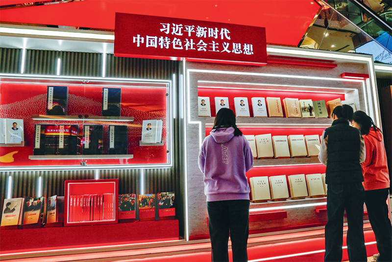 习近平新时代中国特色社会主义思想是坚持“两个结合”、推进马克思主义中国化时代化的最新理论成果,是中华文化和中国精神的时代精华,实现了马克思主义中国化时代化新的飞跃。图为2025年2月26日,读者在北京图书大厦习近平新时代中国特色社会主义思想专区阅读习近平总书记重要著作。 张琳/摄