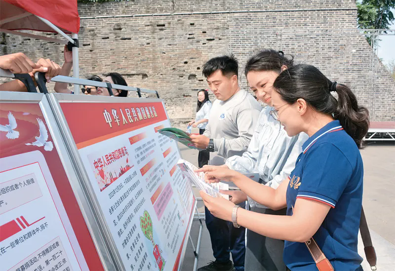 2024年9月5日,修改后的《中华人民共和国慈善法》正式施行。慈善法的修改,为推动中国特色慈善事业高质量发展提供更强有力的法治保障。图为当日,河南省开封市慈善总会在开封市大南门瓮城城墙广场举行庆祝第九个“中华慈善日”宣传活动,志愿者在活动现场为群众宣传新修改的慈善法。中国慈善联合会供图