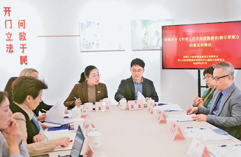 图为2023年2月7日,在上海市长宁区虹桥街道基层立法联系点召开的征询会上,工作人员听取相关人士对《中华人民共和国慈善法(修订草案)》的意见和建议。新华社记者 刘颖/摄
