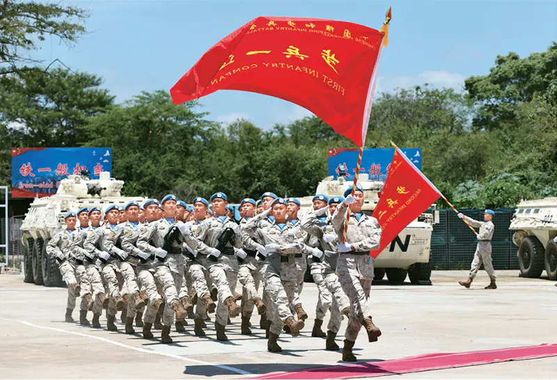 图为2023年9月28日,联合国驻南苏丹特派团(联南苏团)在其超级营地举行授勋仪式,向中国第九批赴南苏丹(朱巴)维和步兵营700名维和官兵授予联合国“和平荣誉勋章”,以表彰他们在执行维和任务期间的卓越表现和为南苏丹和平事业作出的突出贡献。新华社发 赵建毅/摄