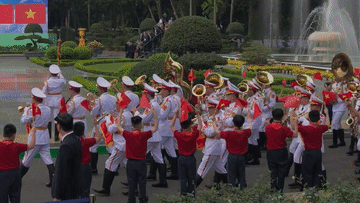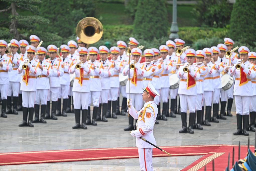 军乐团奏中越两国国歌,鸣礼炮21响。
