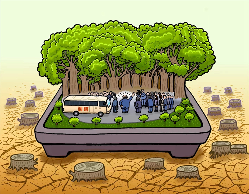 扭转这一局面,需从思想、机制、监督三端发力。领导干部要以“解剖麻雀”的精神,摒弃“盆景式”调研思维,主动聚焦群众关切的“槽点”“痛点”;调研安排应减少预设路线,通过随机走访、蹲点调研等方式,直插田间地头、企业车间获取一手资料;同时,构建纪检监察部门监督、群众参与评价的立体监督体系,对“走过场”“摆花架”的调研行为严肃追责。唯有让调研回归发现问题、解决问题的本质,才能确保政策制定“接地气”,执行“有底气”,真正把民生实事办到群众心坎上。(漫画作者:王真 黑龙江省漫画艺委会副主任;漫评策划:徐辉冠)