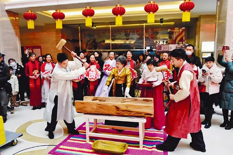 2025年1月21日,2025年“非遗贺新春——延边过大年”系列活动在延边博物馆启动。现场设乐舞、指尖、舌尖三大板块,展演、展示、品鉴精彩不断,吸引众多市民游客。图为活动启动当日,朝鲜族做传统打糕的场景展示。吉林省委宣传部供图 金由美/摄