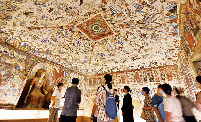 图为2022年7月10日,观众参观用数字技术复制的等比例敦煌第285窟。新华社记者 李欣/摄