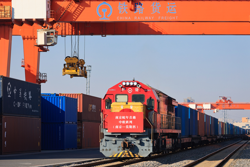 图为2025年1月29日,在南京铁路物流中心尧化门站货场,满载集装箱的中欧班列准备发车。当日是农历大年初一,一列满载110标箱纺织品、汽车配件、电子机械设备等货物的中欧班列从南京铁路物流中心尧化门站货场启程,开往俄罗斯莫斯科,这是农历新年南京开出的首趟中欧班列。新华社发 苏阳/摄