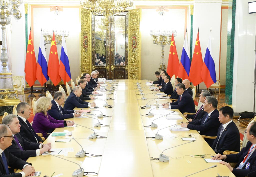 当地时间5月8日下午,普京同习近平在克里姆林宫总统办公室进行茶叙。