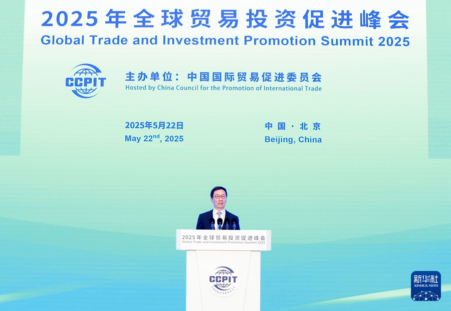 新华社北京5月22日电 5月22日,国家副主席韩正在北京出席2025年全球贸易投资促进峰会开幕式并致辞。