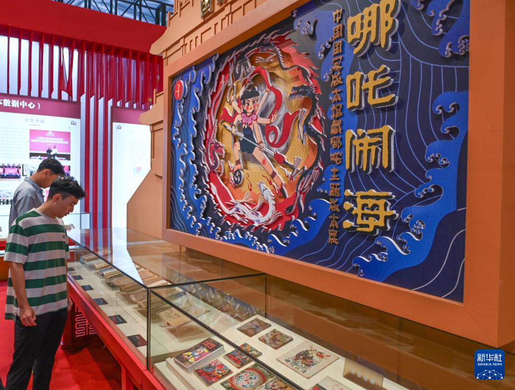 5月22日,观众在文博会中国国家版本馆展台参观哪吒主题版本展。