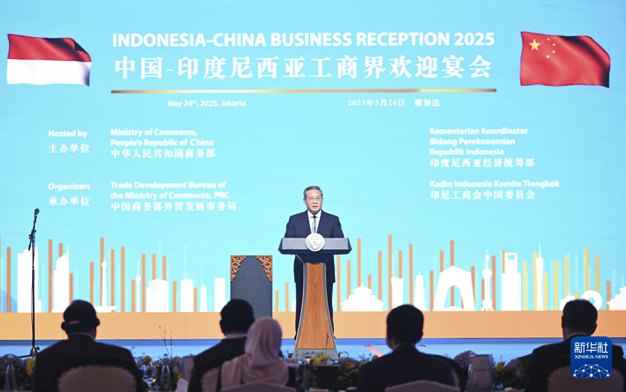 当地时间5月24日晚,国务院总理李强在雅加达同印度尼西亚总统普拉博沃共同出席中国-印尼工商界晚宴并致辞。新华社记者 李响 摄
