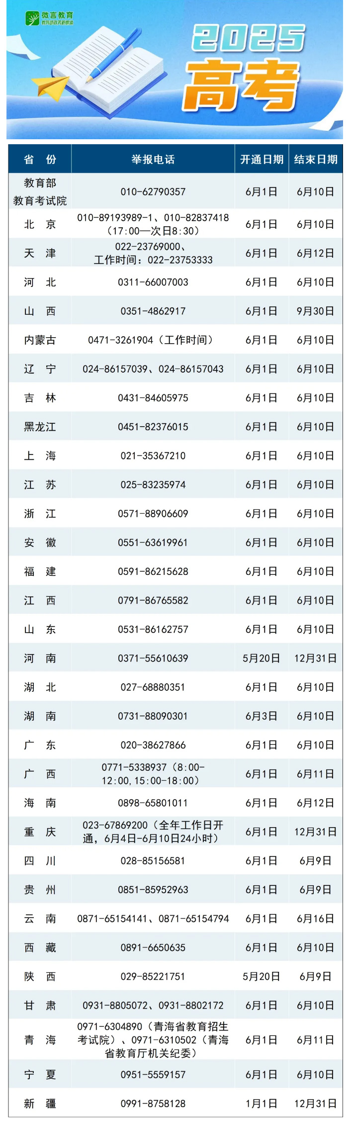 近日,教育部统一公布了教育部以及各省(区、市)2025年的高考举报电话,欢迎广大考生、家长及社会各界人士及时举报反映涉及2025年高考的问题线索。教育部及各省(区、市)将会同有关部门根据举报线索第一时间核查处理,坚决维护高考公平公正。