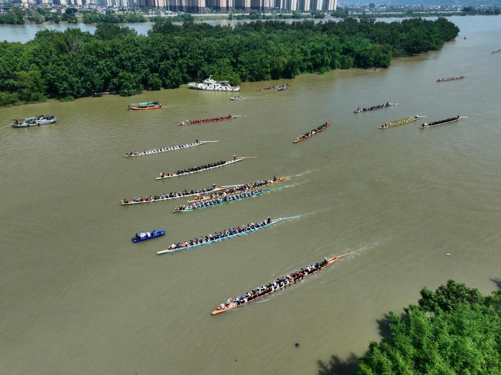 5月31日,在福州市闽侯县大樟溪南港段,民间龙舟队在端午竞渡活动中比拼(无人机照片)。新华社记者 姜克红 摄
