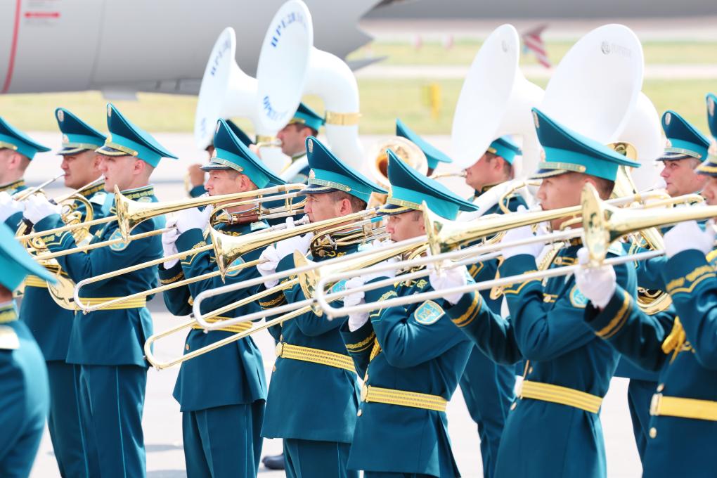 礼兵分列蓝地毯两侧致敬,哈萨克斯坦少年儿童手持中哈两国国旗热烈欢迎习近平到访。
