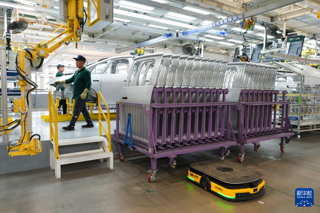 6月18日,全自动无人化的自动导向车在理想汽车北京智能制造基地焊装车间运送零部件。