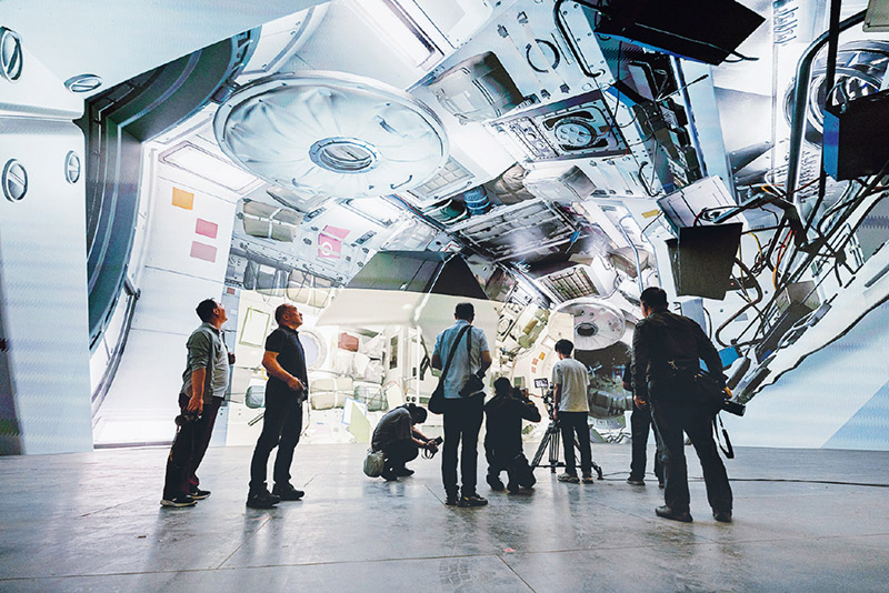 电影科技的发展、技术美学的进步、叙事方式的创新、视觉图谱的转换,为讲好中国故事、实现中华优秀传统文化创造性转化和创新性发展提供了坚实支撑。图为2025年4月10日,参观者在浙江省湖州市德清县莫干山AI影视城体验AI虚拟制片技术。 人民图片