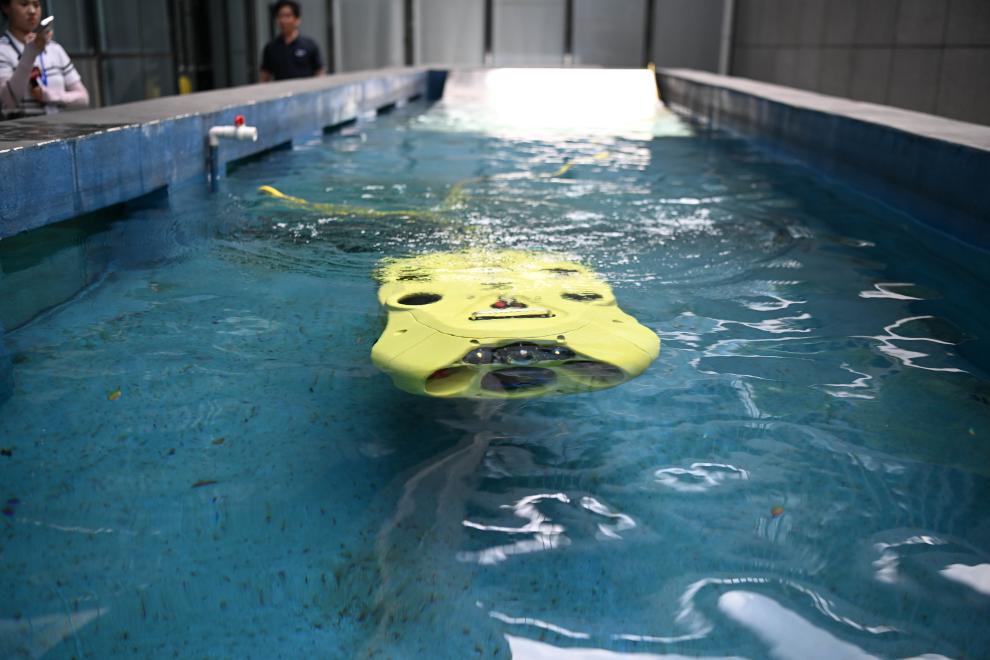 在长方形的测试水池里,一台明黄色的“铁疙瘩”时而浮出水面,时而沉入水底,看似笨重的身躯却灵活得仿佛一条游动的鱼。这款用于水下检测的智能机器人,可以在“一沉一浮”间实现对水下情况全方位、无死角的探测作业。