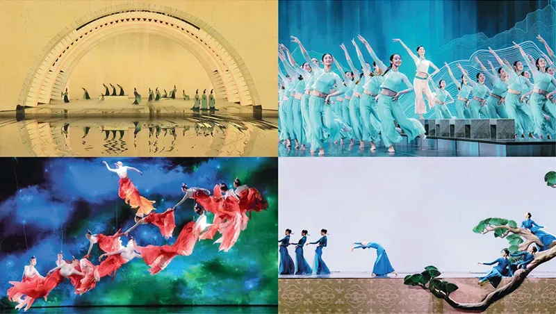 舞蹈作为一门艺术形式,具有独特的审美价值。图为近年来中央广播电视总台春节联欢晚会上的舞蹈《只此青绿》(左上)、《碇步桥》(右上)、《锦鲤》(左下)、《喜上枝头》(右下)。这些舞蹈彰显了中华民族深厚的历史和文化底蕴,成为展示中华美学的一道亮丽风景线。 中央广播电视总台供图
