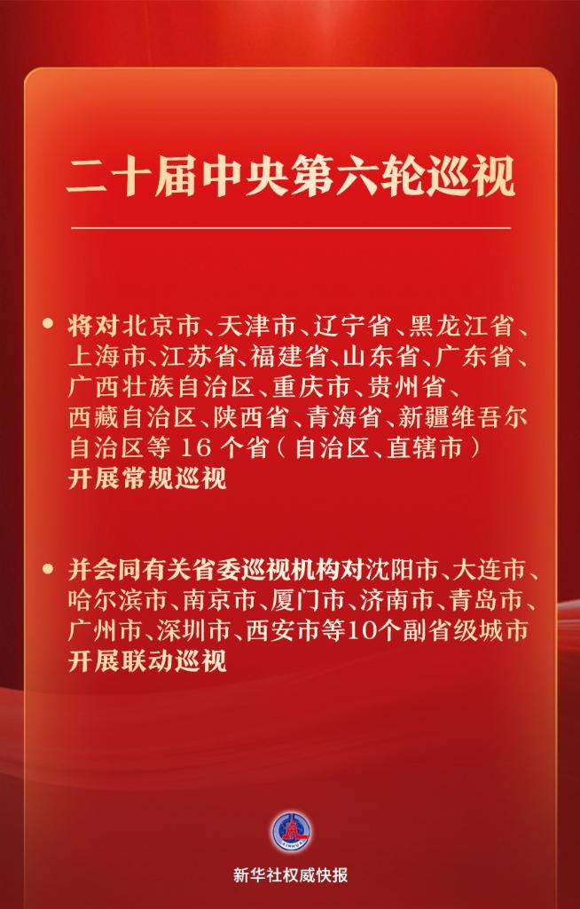 新华社北京7月14日电 经党中央批准,二十届中央第六轮巡视将对北京市、天津市、辽宁省、黑龙江省、上海市、江苏省、福建省、山东省、广东省、广西壮族自治区、重庆市、贵州省、西藏自治区、陕西省、青海省、新疆维吾尔自治区等16个省(自治区、直辖市)开展常规巡视,并会同有关省委巡视机构对沈阳市、大连市、哈尔滨市、南京市、厦门市、济南市、青岛市、广州市、深圳市、西安市等10个副省级城市开展联动巡视。