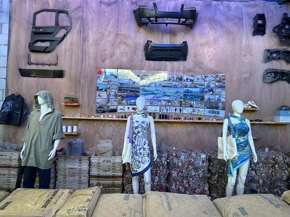 在浙江蓝景科技有限公司加工车间展示区,展示着由海洋塑料垃圾处理加工制成的衣服、鞋子等生活用品。新华社记者李梦婷 摄