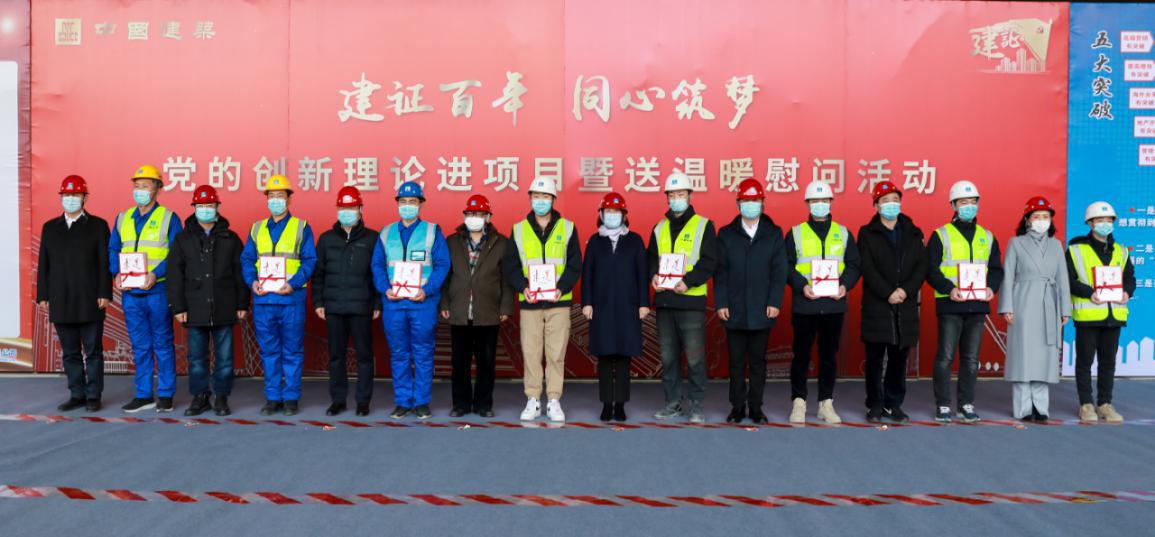 本网讯 1月22日,中建集团在中建二局国家会议中心二期(配套)项目开展“建证百年 同心筑梦”党的创新理论进项目暨送温暖慰问活动,求是杂志社、国务院国资委、中国海员建设工会、中建集团相关负责人等出席活动,为项目党员、农民工党员赠送《求是》杂志并交流学习心得。