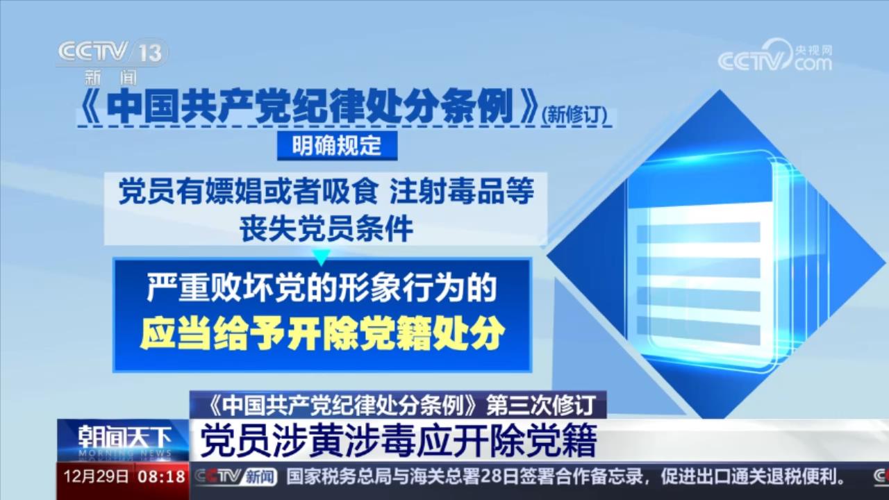 针对近年来,一些党员干部出现的违反国家财经纪律、涉黄涉毒等违法行为,此次新修订的《条例》,对相应纪律处分规定进行明确,做到执纪执法贯通融合。