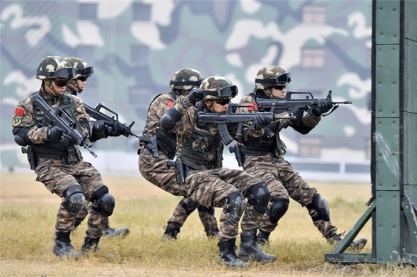 武警福建总队机动支队特战大队官兵进行小队战术训练。