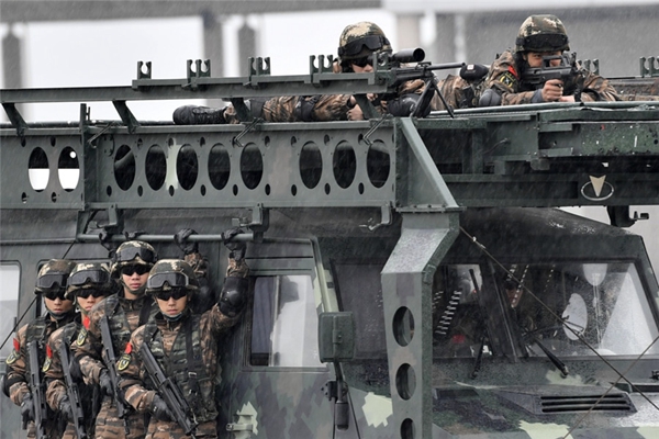 武警福建总队机动支队特战大队官兵在小队战术训练中交替掩护穿插前进。