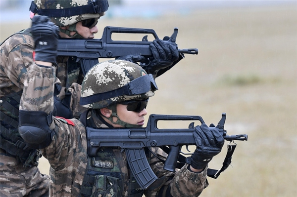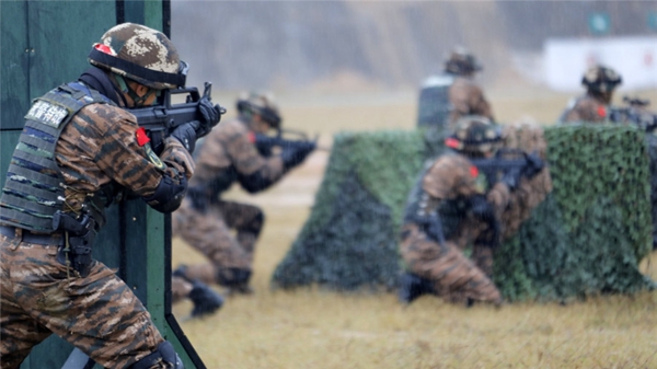 武警福建总队机动支队特战大队官兵在小队战术训练中急停射击。