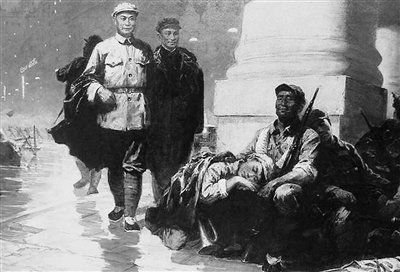 油画《拂晓》局部:进城后解放军露宿上海街头