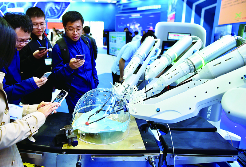 新技术、新产品的涌现创造源源不断的市场新需求。图为观众在观看2018年10月全国“双创周”北京会场主题展展出的一款腔镜手术机器人在做模拟组织缝合手术。 新华社记者 罗晓光/摄