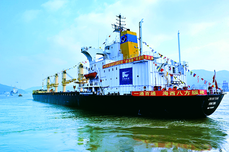 2008年12月15日,海峡两岸海上直航福州港首航仪式举行。图为直航台北港的货轮徐徐离开福州马尾港。 新华社记者 张国俊/摄