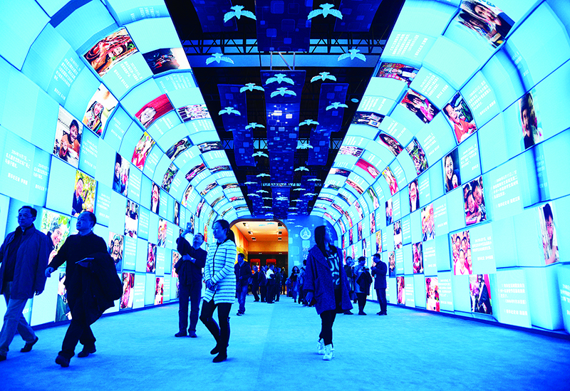 2018年11月13日,“伟大的变革——庆祝改革开放40周年大型展览”在国家博物馆开幕。图为观众在参观“大美中国”影像长廊。 宁颖/摄