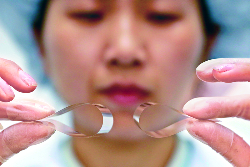 中国在供给侧结构性改革中握紧“先进制造”钥匙,推动经济高质量发展。图为秦皇岛星箭特种玻璃有限公司的工人在检查高强度柔性抗辐照玻璃盖片的质量,该公司产品先后用于神舟、嫦娥、天宫等卫星与航天器上。 新华社记者 杨世尧/摄