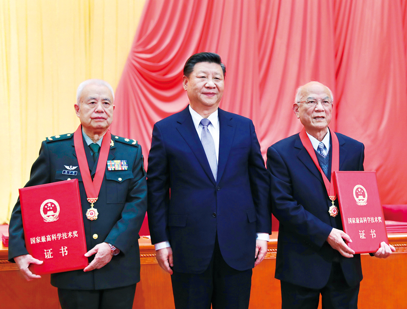 2019年1月8日,2018年度国家科学技术奖励大会在北京人民大会堂隆重举行。中共中央总书记、国家主席、中央军委主席习近平向获得2018年度国家最高科学技术奖的哈尔滨工业大学刘永坦院士(右)和中国人民解放军陆军工程大学钱七虎院士(左)颁奖。 新华社记者 谢环驰/摄