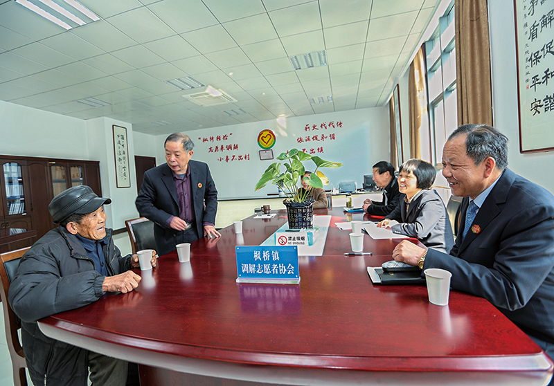 上个世纪60年代初,浙江诸暨枫桥通过发动和依靠群众,坚持小事不出村、大事不出镇、矛盾不上交,就地化解矛盾,实现了“捕人少,治安好”,创造了“枫桥经验”。多年来,“枫桥经验”展现出历久弥新的魅力,成为全国政法综治战线的一面旗帜。图为诸暨市枫桥镇枫源村调解志愿者联合会接待室,调解志愿者正在为与邻居产生矛盾的村民调解,一番耐心解释,这位村民消除了误会,满意而归。 中央政法委宣教局供图
